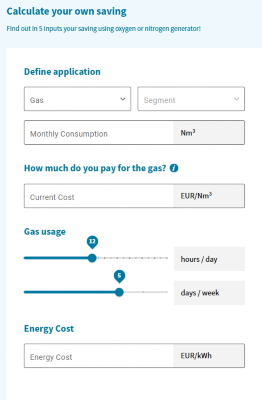 باستخدام حاسبة التوفير من اطلس كوبكو، يمكنك تقدير المدخرات المحتملة عند التبديل إلى توليد الغازات داخليًا بدلًا من شرائها من الموردين. أداة سهلة الاستخدام توفر لك نتائج فورية وقرارات مبنية على بيانات دقيقة - تمنحك هذه الأداة نظرة دقيقة على التكاليف والفوائد عند التحول إلى الإنتاج الذاتى باستخدام مولدات الغاز.