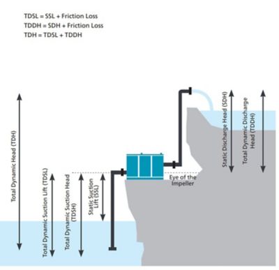 Da Pumpenhersteller die Parameter für das Saugniveau nicht kennen können, berechnen sie die Gesamtförderhöhe (Abbildung 1). Dazu subtrahieren sie die gesamte Saughöhe, die als Höhe über dem Meeresspiegel gemessen wird, von der Gesamtdruckhöhe.Die nächste wichtige Überlegung ist, wieviel Reibung berücksichtigt werden muss. Der Reibungsverlust hängt von Länge und Durchmesser der Rohrleitungen, Bögen und Schieber ab, durch die die Flüssigkeit fließt. Die Summe aus Förderhöhe und Reibungsverlust ergibt die Gesamtförderhöhe.Die Gesamtförderhöhe ist ein zuverlässigerer Indikator für die Pumpenleistung als der Druck, da sie angibt, was die Pumpe unabhängig von den Ansaugbedingungen leisten kann. Die Gesamtförderhöhe in Kombination mit der Fördermenge sind Ihre Anhaltspunkte für die Auswahl der richtigen Pumpe.