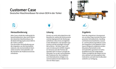 Die Lösungen von Atlas Copco basieren auf Schnittstellen und modularen Konzepten. Dadurch ermöglichen wir eine nahtlose Integration verschiedenster Technologien – von Schraub-, Dosier- und Stanzniettechnik über Bildverarbeitung bis hin zu Robotik. Das Ergebnis: flexible, skalierbare Systeme, die optimal auf Ihre Produktionsanforderungen abgestimmt sind.