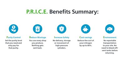 Die Stickstofferzeugung vor Ort bietet mehrere strategische Vorteile, um die Kosten und betriebliche Effizienz der Unternehmen zu optimieren. Die Stickstofferzeugung vor Ort bietet fünf wichtige Vorteile, die im nachstehenden P.R.I.C.E. (Purity control, Reduce wastage, Increase safety, Cost savings, Environment)-Modell zusammengefasst sind.