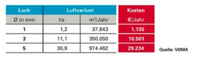 *) Berechnungsgrundlage: Betriebsdruck 6 bar | Druckluftsystem 8.760 h/Jahr in Betrieb Kosten 0,03 3/m3 (inkl. Investitionen, Wartung und Energie) Hinweis: Als Lochdurchmesser kann eine einzelne Leckage oder der Gesamtdurchmesser vieler kleiner Leckagen verstanden werden.)