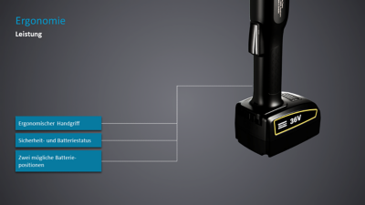 - Efficiency: Die energieeffizienteste Arbeitsweise – für eine längere Akkulaufzeit bei Anwendungen wie z.B. Verzurren und Umreifen.