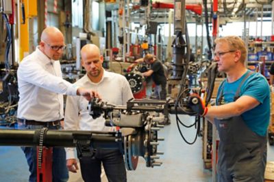 Gigant-Ingenieur Tobias Krieg (links) und Atlas-Copco-Mitarbeiter Wilfried Kampen betrachten die Schraubgewindebolzen an den Naben der aktuellen Fertigung. Die Prozessoptimierer von Atlas Copco geben dem Achsenhersteller immer wieder wertvolle Tipps in Sachen Schraubtechnik. (Bild: Atlas Copco Tools)