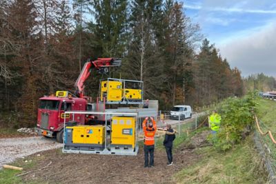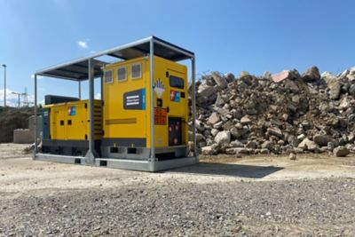 Bei Walo Bertschinger sind aktuell zwei Hybridspeicher im Einsatz, die elektrische Pumpen mit Strom versorgen. Die Anlagen werden für den Bau eines längeren Autobahnabschnitts zwischen Thun und Spiez in der Schweiz benötigt. (Bild: Atlas Copco)