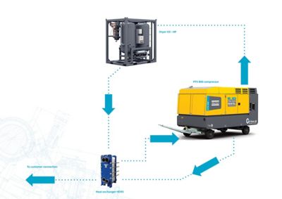 All atmospheric air contains water vapor, but as air is being compressed, the relative humidity of water increases to 100%. To avoid problems caused by water precipitation in pipes and connected downstream equipment, compressed air must be dried. In an additional stage, the air is heated as well to further improve the drying process. A Dry Hot Air Solution with a PTS 800 looks like this: