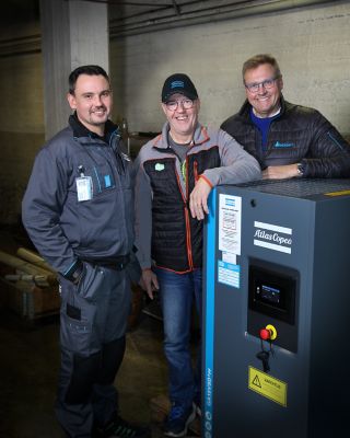 Tommy Glasberg, Lasse Matkoski ja Juha Riippi käyttöönottamassa uutta kompressoria. Atlas Copcon kompressorikilpailun voittaja sai uuden VSD+FF kompressorin.