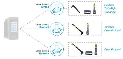 Il est également possible de n’utiliser qu’un seul coffret de contrôle pour plusieurs visseuses asservies, principalement grâce à l’utilisation des technologies sans fil. La station virtuelle est le cœur des fonctions d'assemblage. La station virtuelle conserve toutes les informations concernant le processus d'assemblage et vous permet ainsi de connaître en temps réel le déroulement de la production. Elle contrôle l'outil, la communication et les accessoires du poste d'assemblage.