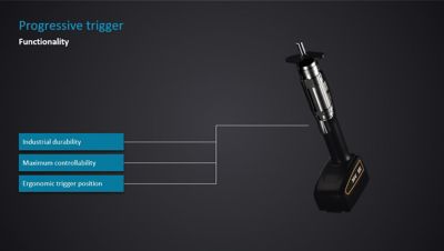 - Il trigger progressivo consente all'operatore di capire ciò che sta accadendo nell'applicazione. Offre il controllo manuale dell'avvio graduale, del posizionamento e dell'arresto controllato.