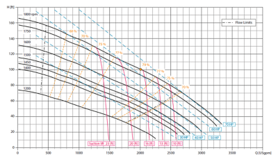 各ポンプには独自の性能曲線チャートがあり、これにより任意の圧力比でポンプが一定時間内に移動させることができる容量がわかります。一定時間内の容量はl/sまたはm3/h、あるいはgpm(ガロン/分)で測定されます。チャートにより、ポンプ流量に対するポンプ出口圧力がわかります。これは、ポンプのデューティポイントまたはポンプ作動ポイントと呼ばれています。