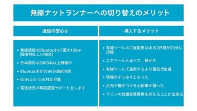 有線ナットランナーを使用していた、コードレスナットランナーへの切り替えを検討している企業もあります。これらの企業は、無線の利便性と柔軟性に魅力を感じており、特に作業効率の向上と作業環境の改善を期待しています。無線ナットランナーは、作業者の動きを制限せず、より自由に作業を行えるため、作業のスピードと精度が向上しています。また、ケーブルが絡まるリスクがないため、安全性も向上しています。それぞれの理由に基づいて、多くの企業がコードレスナットランナーへの移行を進めています。