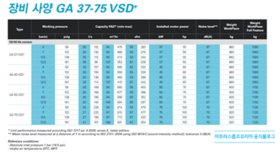컴프레셔를 선정하기 전, 확인해야 할 두 번째 사항은 바로 기재되는 유량의 기준 조건입니다. 이는 컴프레셔 구매자들이 많이 놓치는 부분 중 하나 이기도 합니다. 이 유량의 기준 조건은 제품 사양서에서 확인이 가능합니다. 아트라스콥코 제품의 사양서에는 유량, 측정 규격과 함께 어떠한 기준 조건으로 환산 되었는지 확인할 수 있습니다. 예를 들어, 1bar의 압력 및 20℃ 온도의 기준 조건으로 환산 되었다는 정확한 기준이 있습니다.