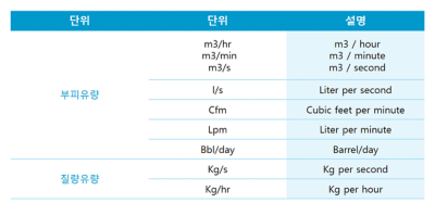 유량의 기본 단위는 부피 유량과 질량 유량으로 나뉘는데, 부피 유량은 m3/hr, l/s, cfm, Lpm 등이 있고 질량 유량은 kg/s, kg/hr가 있습니다.