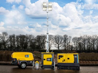 De Atlas Copco Power Technique-portfolio - Uitrusting op het gebied van mobiele compressoren, generatoren, verlichtingspalen en pompen.