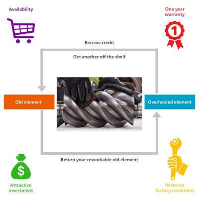 O elemento compressor é a parte fulcral da sua máquina. E após um período entre 6000 e 8000 horas de funcionamento, o seu elemento compressor irá necessitar de ser renovado para regressar à respetiva eficiência original. Este programa de substituição da Atlas Copco permite-lhe substituir rapidamente o seu elemento antigo por um elemento renovado, uma vez que o elemento renovado está pronto para a substituição.