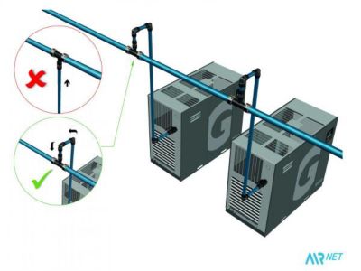 Rețeaua principală de aer trebuie proiectată pentru a reduce căderea de presiune și pentru a vă asigura că o cantitate potrivită de aer ajunge la aplicație la presiunea dorită. Alegeți conductele cu dimensiunea corectă pentru debitul de aer, presiunea și distanța dintre compresor și punctele de utilizare. Verificați dacă există scurgeri de aer - pe o gaură de doar 6 mm în diametru, va scurge 28 l / s de aer și ar putea în cele din urmă să coste peste 4000 Euro / an doar pentru a recupera scurgerile de aer. De asemenea, luați în considerare construcția conductelor și a armăturilor. Țevile și îmbinările din oțel pot fi dure și pot genera căderi de presiune. Pe de altă parte, o țeavă de aluminiu va evita această turbulență și va produce aceeași presiune la sfârșitul traseului de aer ca la început. O scădere a presiunii de doar 25 de milibari va duce la o pierdere de eficiență de 2%.