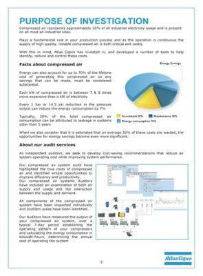 Întreprinderile care doresc să scadă costurile de producție și să îmbunătățească eficiența energetică ar putea beneficia de un audit al sistemului lor de aer comprimat. Analizele estimează că astfel de sisteme reprezintă 10 la sută din toată energia utilizată în industria globală și că 10-30% sunt pierderi în urma scurgerilor de aer. Această risipă poate fi foarte scumpă, deoarece chiar și o gaură în țevile de aer comprimat de 3 mm ar putea costa aproximativ 2000 de lire sterline pe an, cu o pierdere de energie echivalentă cu 16 tone de emisii de CO2.