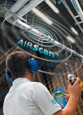 Atlas Copco efectuează sondaje ale scurgerilor cu metode de test ultrasonice ca parte a serviciului lor de audit energetic AIRScan, care verifică debitul, puterea și calitatea aerului și evaluează nivelurile de întreținere, precum și scurgerile.