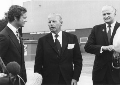 Его Величество Король Щвеции Карл XVI Густав, Питер Валленберг ст. и Президент «Атлас Копко» Том Вахтмайстер по случаю королевского визита в «Атлас Копко» в Великобритании, 1975.