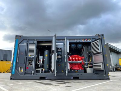 The new TwinAir 2800+ houses two identical diesel-driven air compressors in a single 20ft container and has been developed to provide the highest output and airflow on the smallest possible footprint. Let’s talk numbers. The TwinAir 2800+ has an airflow rate of 2800 cfm or 80m³/min – and a pressure range from 15 barg (220 psig) up to 35 barg (500 psig). The innovations don’t stop there. When space is limited, sometimes the only way is up. In compliance with ISO 14122 standards and offshore requirements, Atlas Copco Rental has developed a lightweight modular ergonomic work platform. It is equipped with a walkway and handrail, which provides safe access and excellent fall protection and thus significantly reducing risks of injuries to the operators. As a Stacked Solution, the TwinAir 2800+ can offer twice its capacity to a record-shattering 5.600 cfm on a 20ft footprint!