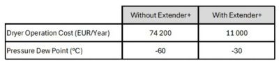 Tack vare den nya installationen har användningen av torkarna övergått från tidsstyrd till behovsstyrd drift. Dessutom regleras kapaciteten nu automatiskt baserat på aktuell tryckluftsförbrukning, och inställningarna för daggpunktsreglering har optimerats. Tillsammans ger detta energibesparingar på över 80 %.