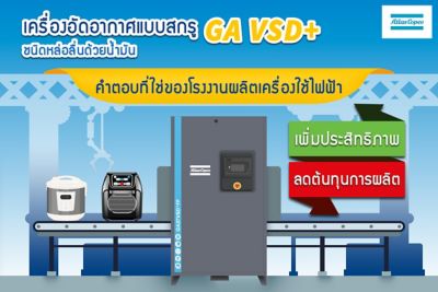 - เครื่องอัดอากาศที่น่าเชื่อถือ ตอบโจทย์ทุกการใช้งาน เครื่องอัดอากาศแบบสกรูชนิดหล่อลื่นด้วยน้ำมัน GA VSD+ จาก Atlas Copco ถูกออกแบบและพัฒนามาอย่างต่อเนื่องเพื่อการส่งมอบอากาศอัดที่ดีที่สุดได้อย่างมีประสิทธิภาพ และสามารถตอบโจทย์การใช้งานของโรงงานผลิตเครื่องใช้ไฟฟ้าด้วยกลุ่มผลิตภัณฑ์ที่หลากหลาย