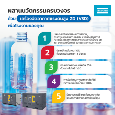 ด้วยการผสานการทำงานของเครื่องอัดอากาศคุณภาพสูงทั้ง 2 เครื่องเข้าไว้ด้วยกัน ทำให้เครื่องอัดอากาศแรงดันสูง ZD (VSD) เป็นเครื่องอัดอากาศที่มีประสิทธิภาพสูงและเพิ่มความน่าเชื่อถือให้กับระบบการผลิตภายในโรงงาน ดังนี้