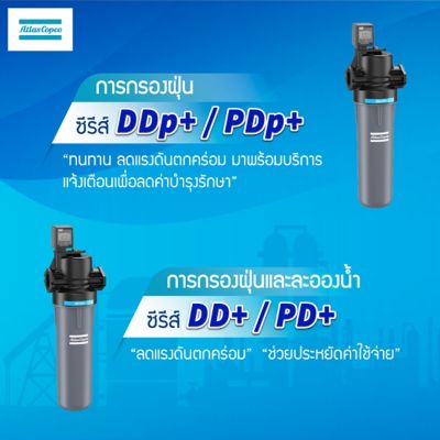 2. การกรองฝุ่นและละอองน้ำมัน ซีรีส์ DD+/PD+: ตัวกรองน้ำมัน ฝุ่นทั่วไป และละอองน้ำด้วยวัสดุห่อหุ้มสำหรับอนุภาคเปียกที่มีชื่อเสียงด้านความทนทาน มาพร้อมเทคโนโลยี Nautilus ผสานหลายชั้นหุ้มเพื่อส่งมอบอากาศอัดที่มีคุณภาพดีที่สุดและลดแรงดันตกให้น้อยที่สุด และยังมาพร้อมบริการแจ้งเตือนการบำรุงรักษาเพื่อประหยัดค่าการบำรุงรักษา