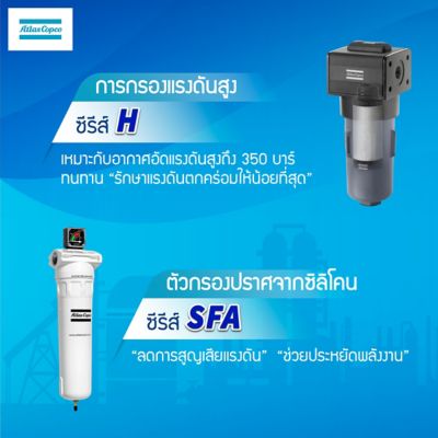 6. ตัวกรองปราศจากสารซิลิโคน ซีรีส์ SFA: ในบางครั้งซิลิโคนที่ผสมในอากาศอัดเพียงน้อยนิดอาจทำให้ชิ้นงานเกิดความเสียหาย ตัวกรองอากาศซีรีส์ SFA จึงได้ถูกผลิตขึ้นด้วยมาตรฐานที่ดีที่สุดในการขจัดซิลิโคนออกจากผลิตภัณฑ์ได้รับการันตีโดย สถาบัน Fraunhofer นอกจากนี้ ตัวกรองอากาศซีรีส์ SFA ยังเป็นหนึ่งในตัวกรองที่ช่วยขจัดสิ่งปนเปื้อนที่ดีที่สุดไม่ว่าจะเป็นฝุ่นเปียกหรือแห้ง ละอองน้ำ รวมถึงละอองน้ำมันด้วยวัสดุการกรองไฟเบอร์กลาสและฟลีซ ที่สำคัญยังช่วยลดการสูญเสียแรงดันและช่วยประหยัดพลังงานได้อีกด้วย
