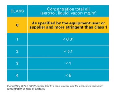 โดยมาตรฐาน ISO 8573-1 (2010) นั้นได้แบ่ง class ความบริสุทธิ์ของลมอัดไว้ ตามปริมาณของสิ่งปนเปื้อนที่วัดได้ ทั้งอนุภาคสิ่งสกปรกต่างๆ ความชื้น และไอน้ำมัน ตามตารางด้านล่าง