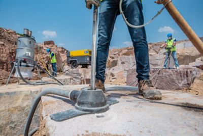 Because the operators aren’t the only ones appreciating the removal of stone dust: the compressor does too. Although Atlas Copco’s mobile compressors have air inlet filters, the ingress of fine particles deteriorates the lifetime of the filters and the engine. A dust collector catches the dust directly at the tool tip and makes use of compressed air to vacuum the dust away and store it in a bag.