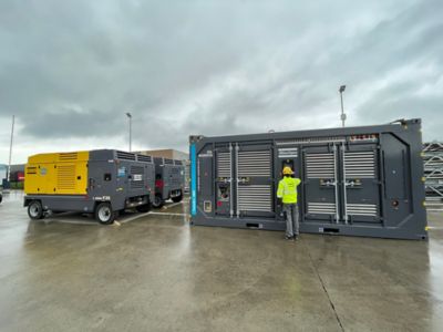 The new TwinAir 2800+ houses two identical diesel-driven air compressors in a single 20ft container and has been developed to provide the highest output and airflow on the smallest possible footprint. Let’s talk numbers. The TwinAir 2800+ has an airflow rate of 2800 cfm or 80m³/min – and a pressure range from 15 barg (220 psig) up to 35 barg (500 psig). The innovations don’t stop there. When space is limited, sometimes the only way is up. In compliance with ISO 14122 standards and offshore requirements, Atlas Copco Rental has developed a lightweight modular ergonomic work platform. It is equipped with a walkway and handrail, which provides safe access and excellent fall protection and thus significantly reducing risks of injuries to the operators. As a Stacked Solution, the TwinAir 2800+ can offer twice its capacity to a record-shattering 5.600 cfm on a 20ft footprint!