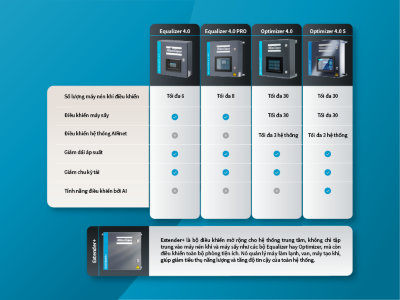 Trong hệ thống khí nén công nghiệp hiện đại, việc lựa chọn bộ điều khiển trung tâm phù hợp đóng vai trò quan trọng trong việc tối ưu hóa hiệu suất, tiết kiệm năng lượng và đảm bảo độ tin cậy vận hành. Bài viết này sẽ so sánh chi tiết các giải pháp điều khiển trung tâm gồm Equalizer 4.0, Equalizer 4.0 PRO, Optimizer 4.0, Optimizer 4.0 S và Extender+, giúp bạn hiểu rõ sự khác biệt về công nghệ, khả năng điều khiển và các tính năng thông minh như AI tối ưu hóa, giám sát năng lượng, và quản lý toàn bộ phòng tiện ích. Qua đó, bạn sẽ có cái nhìn tổng quan để lựa chọn giải pháp phù hợp nhất cho hệ thống máy nén khí của mình.